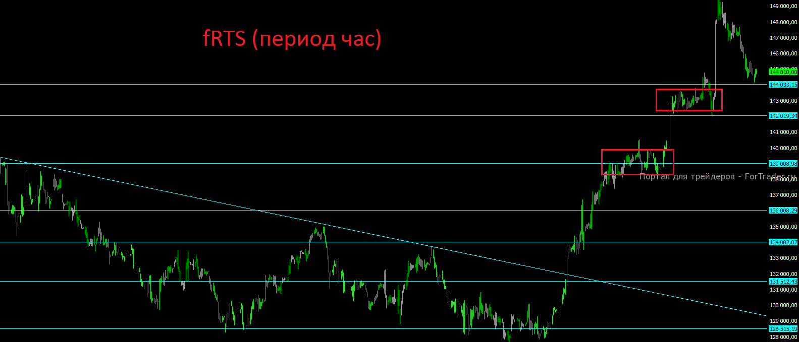 Фьючерс на индекс РТС также вплотную подошёл к зоне поддержке 144000-142000 пунктов. Пока отметка 144000 пунктов будет сдерживать продавцов, но если мы увидим пробой и закрытие дня ниже отметки 142000 пунктов, то стоит готовиться к более существенной коррекции.