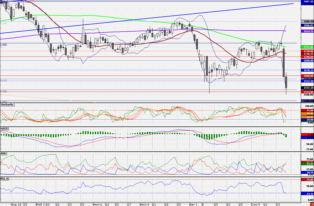 На прошлой неделе акции вновь свалились в район 1500 руб., где располагается нижняя граница боковика, сформированного по бумагам еще в августе. Ближайшей целью для отскока является 1570 руб., вблизи данной отметки спекулятивный «лонги» следует закрыть. Психологическая отметка 1500 руб. – привлекательный уровень для покупок.