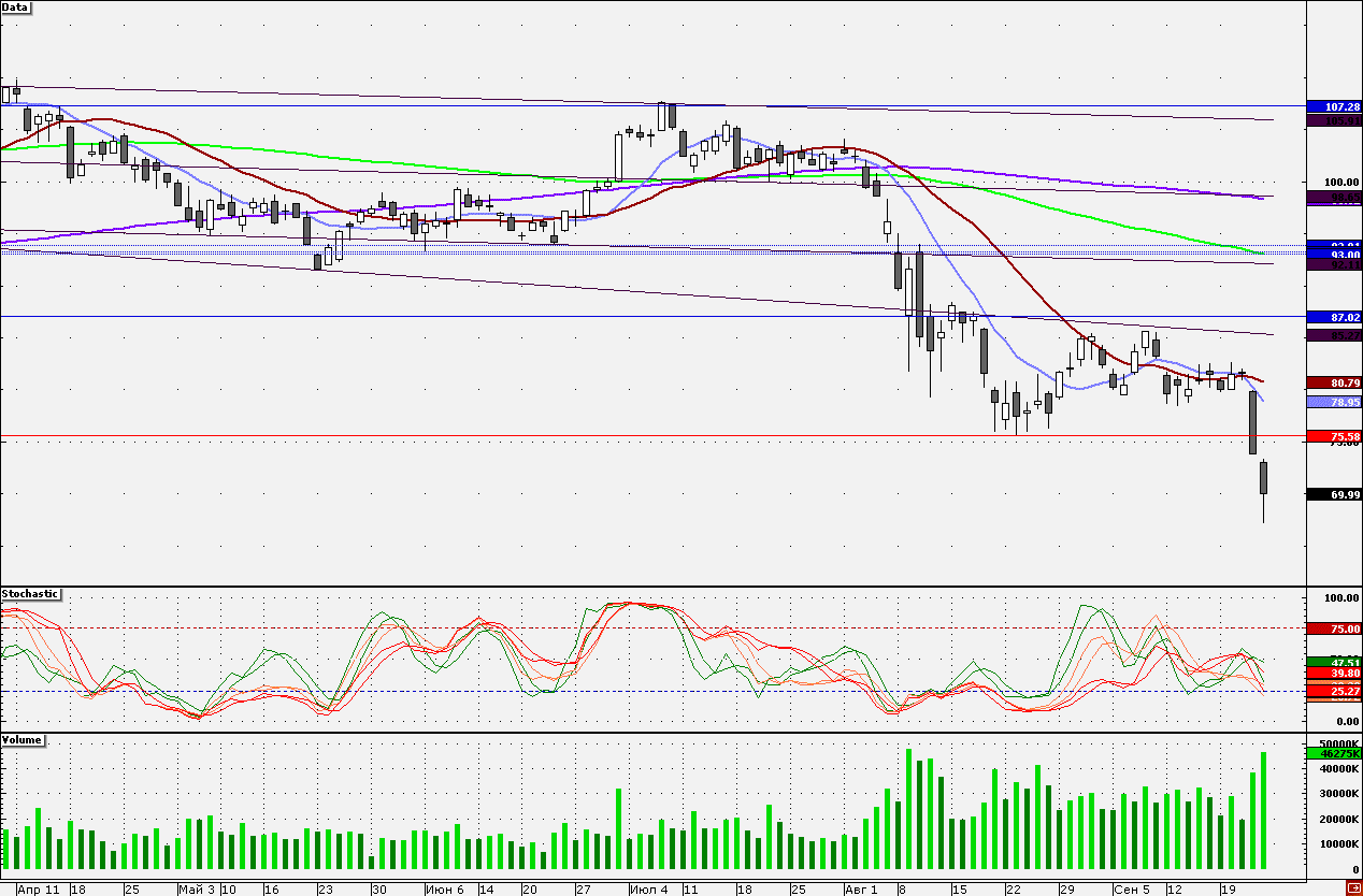 Акции банка активно снижались на прошлой неделе, по итогам которой закрытие состоялось в районе 70 руб. В случае продолжения распродаж акции могут вновь уйти на годовой минимум – 67,16 руб. В противном случае акции могут попытаться закрыть гэп, сформированный в пятницу — 73,80 руб.