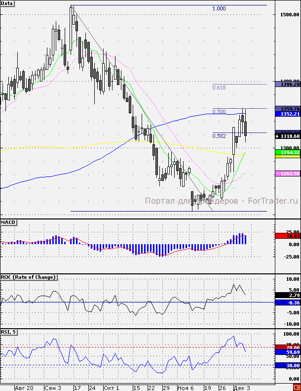 Динамику хуже рынка демонстрируют акции «Акрона» на фоне продолжения фиксации прибыли после неплохого роста. Так бумаги эмитента в очередной раз безрезультатно протестировали сопротивление на отметке 1350 руб., где проходит уровень 50%-коррекциии по Фибоначчи между сентябрьским максимумом и ноябрьским минимумом текущего года. По показаниям технических индикаторов на дневном графике снижение может быть продолжено. Так, сигнал на продажу показал индикатор RSI(5,30%,70%), а индикатор MACD(5,10,5) близок к этому. При этом индикатор ROC(5) нацелился на нулевую отметку, что также не противоречит негативному сценарию. Ближайшей поддержкой выступает уровень 1300 руб., далее – 1280 руб. До появления сигналов на покупку я бы не рекомендовала инвесторам торопиться с открытием лонгов. Наш 30-минутный торговый робот открыл «шорт» от отметки 1335 руб.