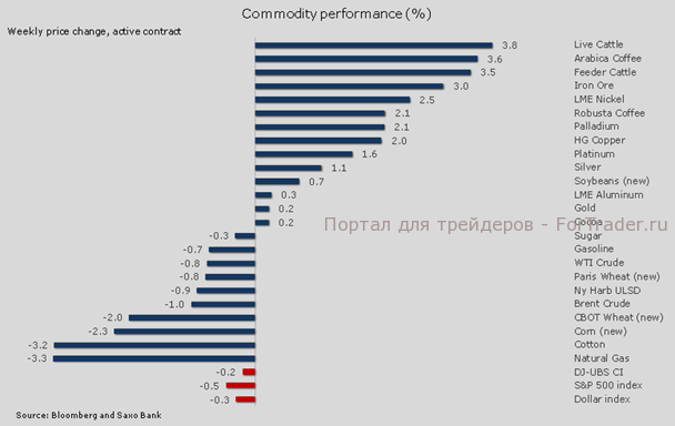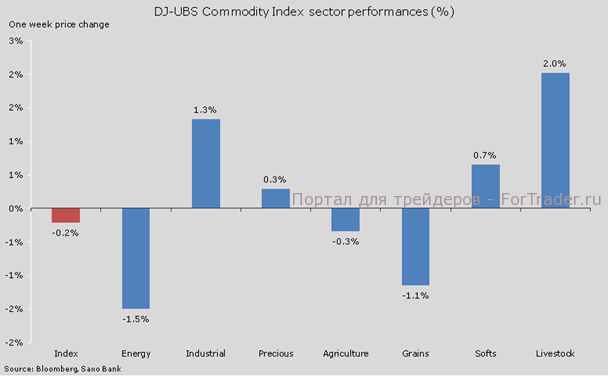 Сырьевые рынки зафиксировали первое за месяц, хотя и небольшое по масштабу падение по итогам торговой недели. Волна продаж накрыла энергетический сектор на фоне информации о том, что поставки нефти из Ирака не были нарушены. Ключевые сельскохозяйственные культуры, в частности кукуруза и пшеница, остаются под давлением главным образом по причине ожиданий высокого урожая в разных уголках мира. Одни из лучших результатов роста показали промышленные металлы, где цена на медь подскочила до максимального за 3,5 месяца значения в условиях сокращения запасов и новостей о том, что экономика США и Китая продолжает восстанавливаться.