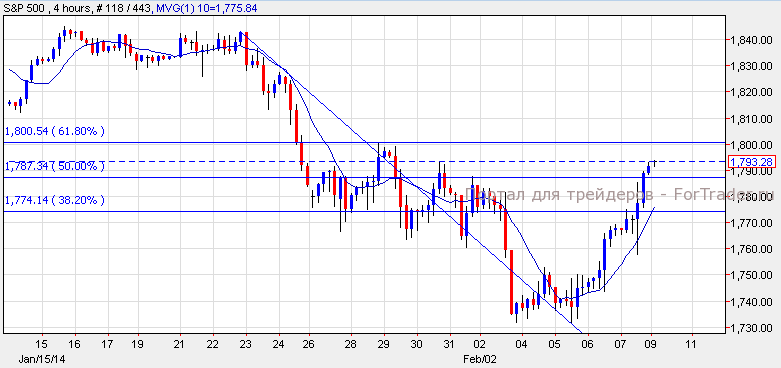 В пятницу Уолл-стрит завершила торговый день в зеленой зоне на фоне ожидаемого роста экономики. Выход отчета по уровню безработицы, который составил 7.0%, поддержал этот рост. S&P 500 вырос на 1.33%, Dow Jones вырос на 1.06%, а NASDAQ добавил к стоимости 1.84%. Согласно техническому анализу 4-часового графика, индекс S&P 500 достиг второго уровня сопротивления 1,787, который также является 50%-ным уровнем коррекции Фибоначчи. Ожидается, что индекс продолжит восходящий тренд до следующего уровня сопротивления 1,800. Если пара пробъет этот уровень, она может вырости к отметке 1,815.