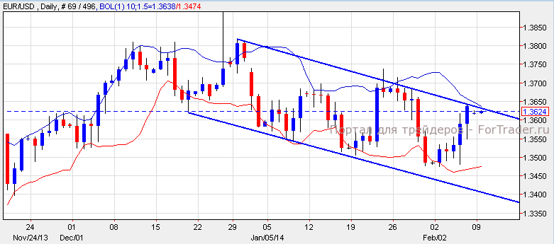 Евро выросло против доллара США, на фоне выхода торгового баланса Германии, который составил 18.5 млрд против прогнозируемых 17.3 млрд. Согласно техническому анализу дневного графика, пара EUR/USD торгуется в восходящем канале. Пребывание на уровне сопротивления 1.3650 может вернуть пару к отметке 1.3550. К тому же, индикатор полос Боллинджера указывает на нисходящий импульс пары EUR/USD, которая не может пробить уровень сопротивления. Инвесторам стоит подождать точных данных, чтобы решить какой импульс будет у пары.