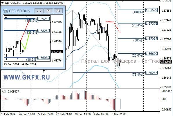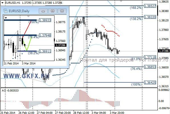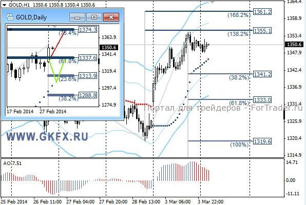 Цены на золото продолжили рост на фоне ситуации в Украине. Отмечается, что принятое решение Москвой о применении вооруженных сил России для сохранения порядка в Крыму повлияло на расстановку сил на рынке. Фондовые рынки свалились, а золото напротив, выросло, это явное перетекание капитала из одной структуры рынка в другую. В соответствии с ожиданиями золото отметилось на новых максимумах с октября 2013 года. Традиционно делаю два варианта движения цены на неделю, основной красный и альтернативный зеленый. Значимые уровни на сегодня отмечены на часовом графике. Индикатор АО находится в положительной зоне и снижается, указывая на коррекцию перед возможным продолжением роста. Индикатор тренда указывает на рост. Покупки от 1341,0 с целями 1348,0, 1354,0 и 1360,0.