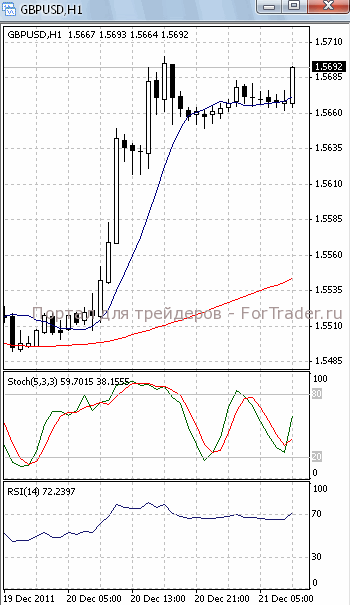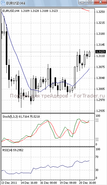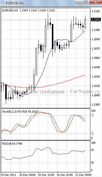 На часовом графике (рис.2) обе скользящие средние приобрели восходящую направленность, тем самым, подтверждая предположение о развитии фазы роста. Вверх развернулся и осциллятор RSI.