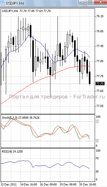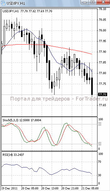 Цены движутся к уровню поддержки 77.60. Если он будет преодолен, продолжится падение, первичной целью которого, скорее всего, станет отметка 77.30 и, далее, 77.00. О возможности такого исхода позволяет говорить направление индикаторов на 4-х часовом графике (рис.1). И обе скользящие средние, и оба осциллятора приобрели нисходящую направленность.