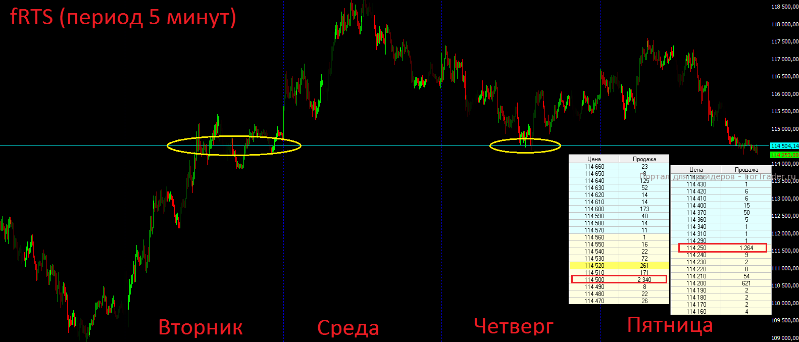 А сейчас вот для примера вам график fRTS (период 5 минут) вся прошедшая неделя. Я не хочу и не буду разбирать всю неделю, хочу просто сделать акцент на пятнице. В пятницу в первой половине дня был классический развод (вынос) аккуратно с перехаем предыдущего дня, а потом всё залили и уже в рамках вечерней сессии мы переписали минимумы предыдущего дня (четверга) и пробили вниз отметку 114500 пунктов, о которой я неоднократно говорил. К сожалению днём я обычно в разъездах и торгую только утром часа два и вечером ещё часа два, поэтому скринов стаканов сделать не успел, когда был вынос вверх, хотя итак понятно, что там висели хорошие лимитники на продажу, но вот зато успел сделать скрины, уже на вечерней сессии, когда мы подобрались и начали пробивать отметку 114500 пунктов. Опять же, в стакане мы не можем увидеть все заявки крупных игроков, так как они могут пользоваться айсбергами или внебиржей, но и в стаканах, при перехае или перелоу дня всегда появляется “крупняк”. Запомните, чем сильнее уровень (речь идёт только о горизонтальных уровнях), тем больше народу его видит, тем больше там народ ставит стопов. И если вы крупный игрок, то грех не воспользоваться пробоем уровня, чтобы практически на одном месте сформировать хорошую позицию. Именно на потоке встречных заявок от срабатывающих стопов и заходят крупные игроки. Опять же, не надо думать, что все крупные игроки одинаковые и работают на одном временном периоде! Нет и ещё раз нет, но принцип формирования позиции у всех почти один и тот же.
