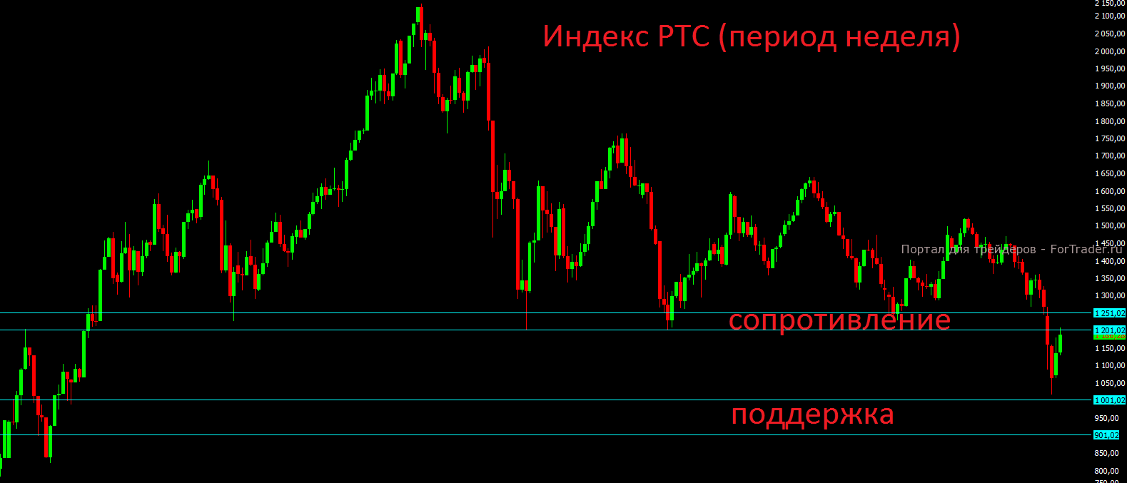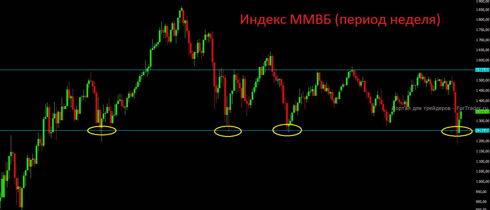 Ну а теперь давайте рассмотрим недельный период российских индексов ММВБ и РТС. Здесь абсолютно две противоречивые технические картины, но есть один очень интересный нюанс, о котором писал выше.