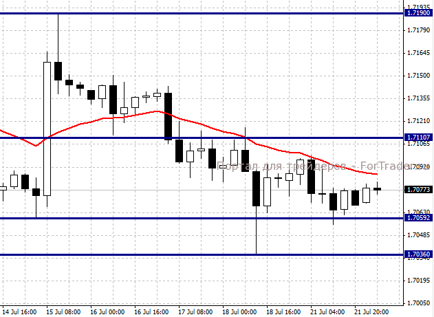 Покупать при отбое от уровня 1,7060 с целью 1,7110. Стоп-лосс = 1,7020. Сегодня в 10.00 GMT будет опубликована статистика по производственным заказам в Великобритании от Конфедерации британских промышленников (CBI). В июле ожидается сокращение баланса заказов с 11 п. до 9 п., что может оказать давление на курс фунта.