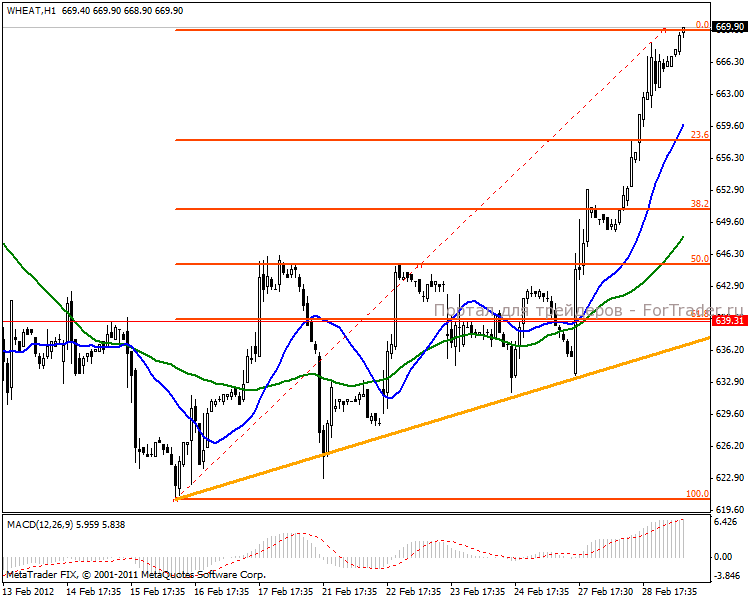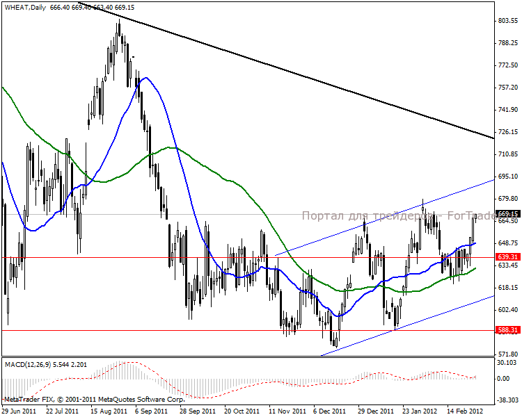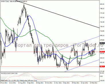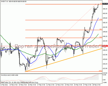 На часовом ценовом графике образовался растущий локальный тренд, котировки выросли за последние 3 дня более чем на 35 долларов за 100 бушелей. В ближайшее время есть вариант скорректировать данный рост к 660 долларов за 100 бушелей. В краткосрочной перспективе ожидаем закрепление текущих позиций на данных уровнях. MACD указывает на восходящее движение к взятию цели 700 долларов за 100 бушелей.