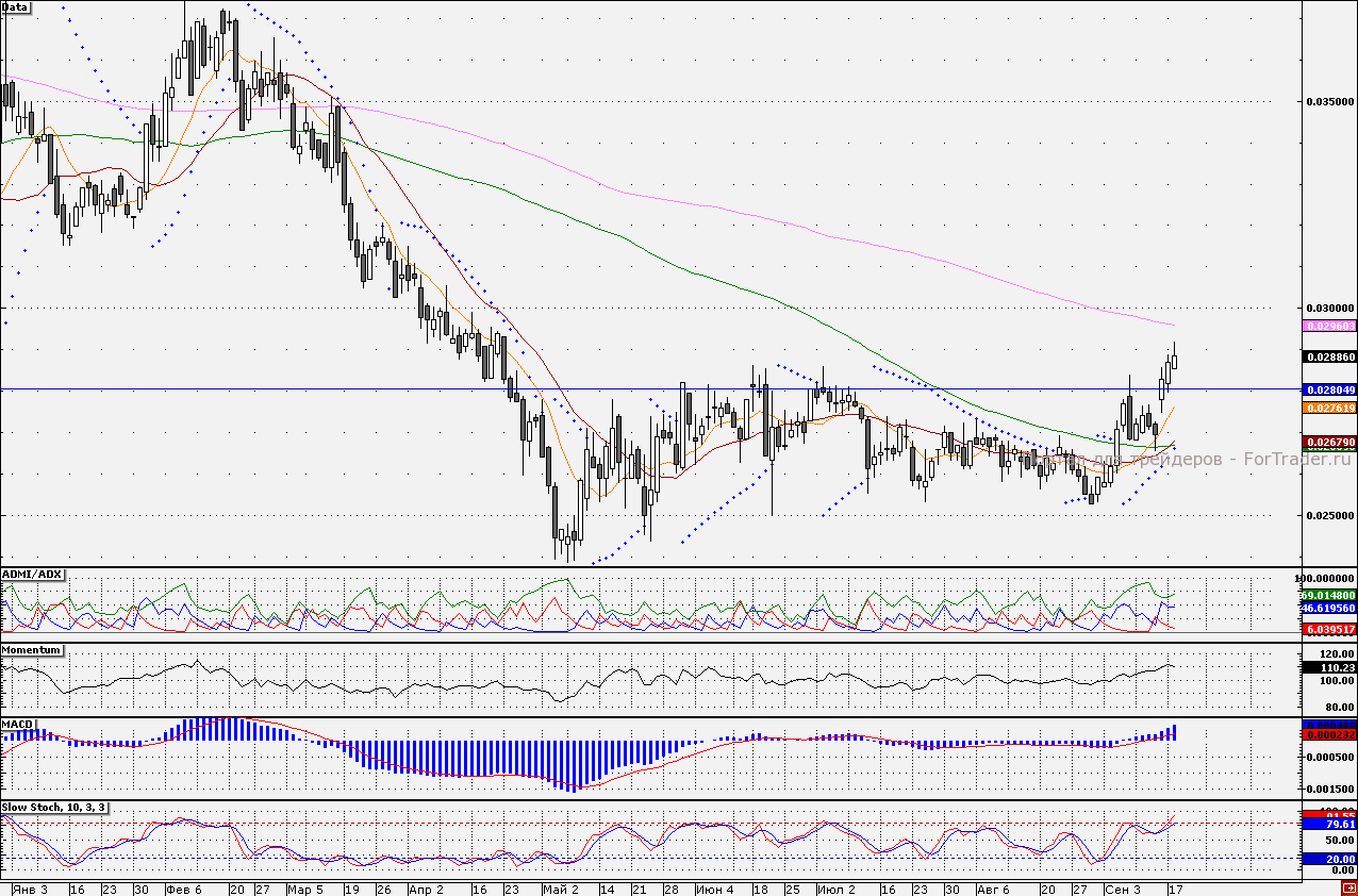 Акции «Интер РАО» накануне закрепились выше важного сопротивления 2,80 коп. Сегодня акции продолжают демонстрировать позитивную динамику. Ближайшей целью по бумагам является отметка 2,96 коп., в районе которой проходит 200-дневная скользящая средняя. Исходя из показаний технических индикаторов данная отметка может быть достигнута. Индикатор ADMI/ADX показывает, что силы «быков» по бумагам преобладают (линия «быков» находится выше линии «медведей»), при этом рост сигнальной линии осциллятора MACD (12;26;9) не исключает вероятности продолжения восходящей динамики акций. Наш 30-минутный торговый робот пока удерживает длинные позиции по бумагам от отметки 2,79 коп. На мой взгляд, стоит удерживать длинные позиции по бумагам с ближайшей целью достижения 200-дневной скользящей средней (сегодня 2,96 коп.).