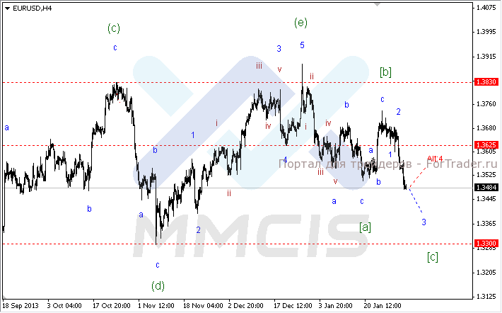 Поэтому в качестве основного сценария на сегодня рассматривается дальнейшее снижение котировок в рамках удлиненной волны «3» нисходящего импульса старшего порядка. Целевым уровнем для третьей волны станет отметка 1.3442, а потенциально и отметка 1.3397. В то же время нельзя исключать альтернативного сценария, согласно которому нисходящая волна старшего порядка завершилась у достигнутых ранее минимумов. Возможность укрепления пары рассматривается в рамках коррекционной волны «Alt:4».