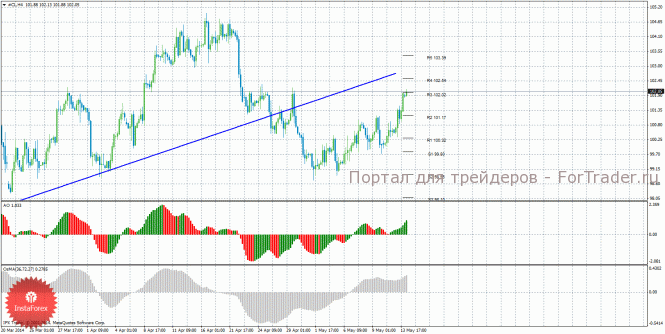 Анализ сырой нефти за 14 мая показывает, что цена продолжает коррекционное движение и отработала уровень сопротивления R3 – 102,02. Нисходящее движение может возобновиться с целями R2 – 101,17 и R1 – 100,32, если цена отскочит от уровня 102,02. Может продолжиться восходящая коррекция с целями уровни 102,54 и 103,39, если цена закрепится выше уровня 102,02. Цена закрепилась ниже восходящей линии, поэтому она более не актуальна. Нисходящей линии тренда на данный момент нет. Индикатор Awesome показывает текущее восходящее движение, так как последний закрытый бар зеленого цвета. OsMA также направлен вверх, что говорит о восходящем характере движения и в более долгосрочном плане. Отскок цены от уровня 102,02 может спровоцировать завершение коррекционного движения.