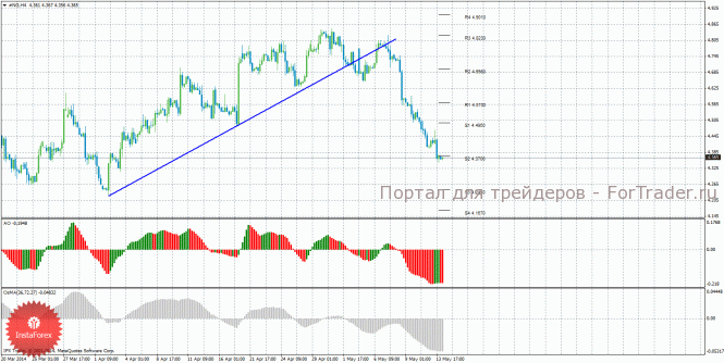По этому инструменту сейчас рекомендуется рассматривать варианты коротких позиций с целями 4,2450 и 4,1670. Стоп лосс выставляется выше ближайшего уровня сопротивления. Рекомендуется выставить стоп лосс в зону безубытка при прибыльности сделки 100-200 пунктов. Если цена отскочит от уровня 4,3700, это может засвидетельствовать новый виток восходящей коррекции, как и разворот наверх Awesome или OsMA (могут разряжаться). Ордера на покупку сейчас не актуальны.
