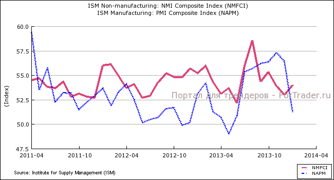 Индекс деловой активности в сфере услуг США от ISM вырос в январе до 54 п. по сравнению с 53 п. в декабре, превысив ожидания роста до 53,7 п. Выросли все подындексы, кроме импорта и новых экспортных заказов. Вместе с тем, наибольший рост показали компоненты запасов, ожиданий роста запасов и цен. Представитель ФРС Локхарт заявил в среду, что сокращение покупок облигаций, вероятно, продолжится и завершится к 4-му кварталу. Ожидаемые к публикации данные могут быть слабыми из-за погодных факторов.