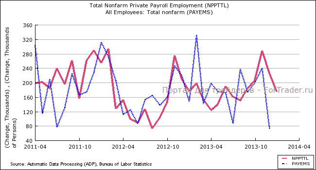 Число новых рабочих мест сокращается уже второй месяц подряд, и их прирост в январе стал минимальным за последние 5 месяцев. Холодная и ветреная зимняя погода продолжала оказывать давление на данные по занятости. Данные от ADP часто рассматриваются как предварительные перед публикацией в пятницу важнейшего отчета Министерства труда США по числу рабочих мест вне сельского хозяйства (Non-Farm Payrolls).