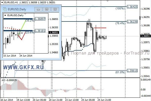 Пара EURUSD совершала рывок наверх, выполнив сделку по рекомендации на покупку, хотя данные по Еврозоне выходили слабые. Сделку можно было исполнить по 1,3614. Первая цель была достигнута на уровне 1,3625, и стоп можно было передвинуть на уровень безубытка. Далее рост пары развития не получил, так как выходила сильная статистика по США. Пара продлила формирование треугольника и сегодня на американских торгах ситуация может получить развязку, так как ожидаются уточненные данные по ВВП США. На эту неделю традиционно рассматриваю два варианта возможного движения цены, основной красный и альтернативный зеленый. Значимые уровни на сегодня отмечены на часовом графике. Индикатор АО находится у нуля, указывая на неопределенность. Индикатор тренда указывает на снижение. Преодоление уровня 1,3625 позволит купить с целями 1,3640 и 1,3670.