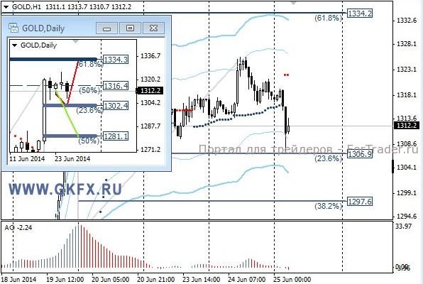 Цены на золото вышли из треугольника вверх, как и ожидалось. Сделку по рекомендации можно было исполнить по 1321,0, но вход с моей точки зрения спорный. Тем не менее, первая цель была достигнута на уровне 1325,0, и стоп можно было перевести на уровень безубытка. Дальнейший рост по золоту не состоялся, поэтому сделку закрыло по безубытку. На дневном графике сформировался пинбар, и поэтому вероятен к исполнению зеленый сценарий. Традиционно делаю два варианта движения цены на неделю, основной красный и альтернативный зеленый. Значимые уровни на сегодня отмечены на часовом графике. Индикатор АО находится в отрицательной зоне и снижается, указывая на желание инструмента двигаться вниз в данное время. Индикатор тренда указывает на снижение. Преодоление уровня 1309,0 позволит продать с целями 1301,0, и 1291,0.