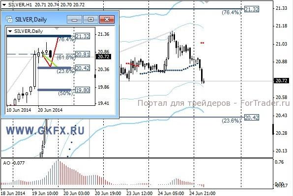 Цены на серебро вышли из треугольника вверх, в соответствии с ожиданиями. Сделку по рекомендации можно было исполнить по 21,04. Первая цель была достигнута на уровне 21,10, и стоп можно было перевести на уровень безубытка. Дальнейший рост не состоялся, поэтому сделку закрыло по безубытку. Сегодня по серебру менее привлекательная ситуация, поэтому стоим в стороне. Традиционно делаю два варианта движения цены на неделю, основной красный и альтернативный зеленый. Значимые уровни на сегодня отмечены на часовом графике. Индикатор АО находится в отрицательной зоне и снижается, указывая на желание инструмента двигаться вниз в данное время. Индикатор тренда указывает на снижение. Вне рынка.
