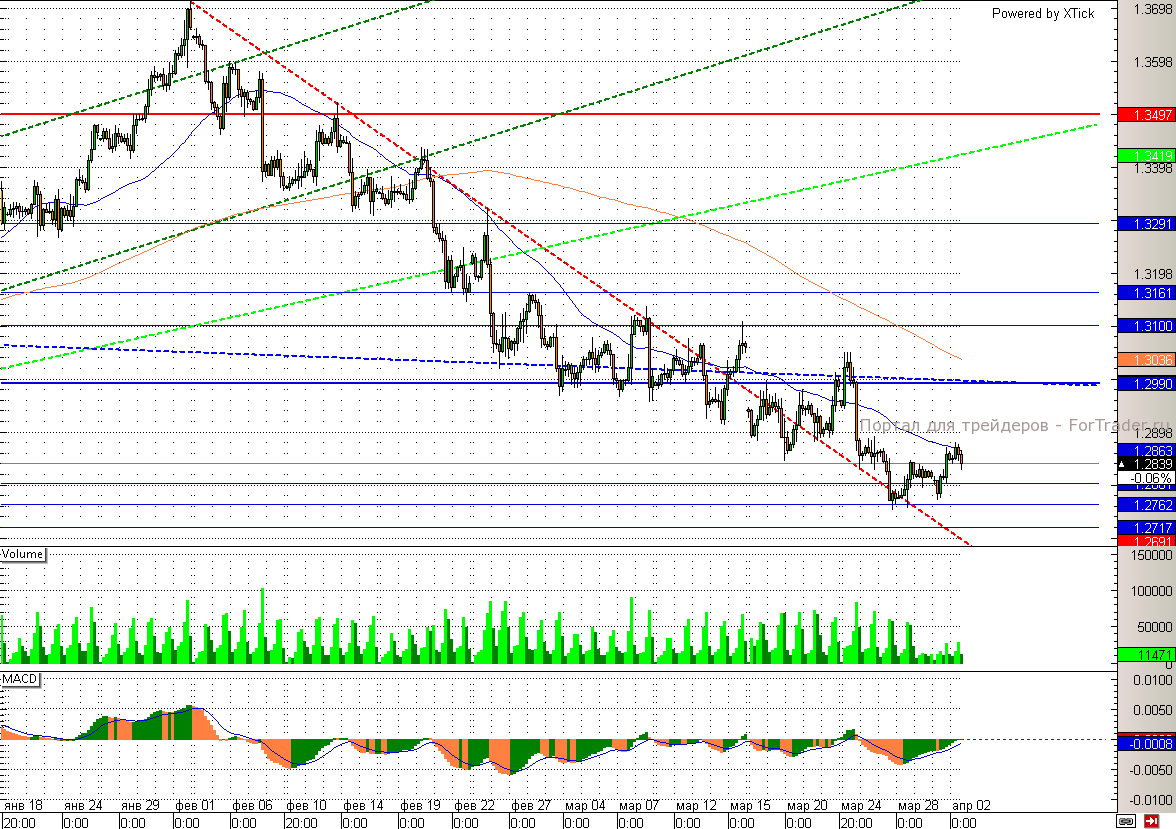 На европейскую валюту сегодня воздействуют противоборствующие факторы. Поддержку европейской валюте оказывает хорошая статистка по региону. Индекс деловой активности в производственном секторе еврозоны за март достиг отметки 46,8, что хоть и заметно ниже так необходимых 50, но лучше ожиданий аналитиков. Между тем укреплению евро препятствует заседание ЕЦБ по ставке в четверг. Риск снижения ставки достаточно высок и на покупки идут единицы. В случае дальнейшего ослабления евро и пробоя 1,275 следующей целью снижения станет отметка 1,26. Целью рост по-прежнему является 1,3.