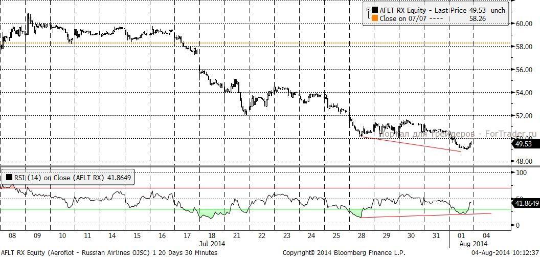 Прекращение работы лоукотстера «Добролёт» явилось, пожалуй, первым печальным звоночком санкций. Но этот сценарий был учтен инвесторами, с начала торговой сессии понедельника акции компании Аэрофлот практически не изменились в своей стоимости. Мы считаем, что сейчас не лучшее время продавать бумаги, так как конвергенция указывает на ослабление «медвежьего» давления.