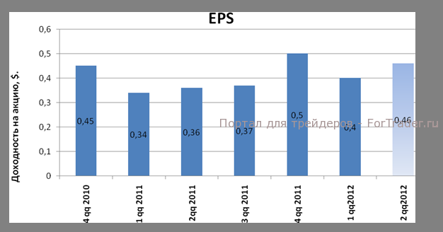 Благодаря усердной работе и качественному руководству Говарда Шульца компания Starbucks corporation продолжает динамично развиваться, несмотря на сложные внешние условия. Финансовый показатели компании за 1 квартал действительно оказались хуже, чем в предыдущем периоде, что, по нашему мнению, может оказать некоторое давление на стоимость акций в краткосрочной перспективе либо мы будем наблюдать консолидацию цен. То есть мы не рассматриваем ситуацию как возможность стремительного снижения цен и нет намерения долгосрочно продавать акции. Так, стоит обратить внимание на амбициозные планы и перспективы компании Starbucks corporation на 2 квартал и до конца 2012 года включительно. Уже во втором квартале можно ожидать увеличения чистого дохода компании на 3,1% до 3,3 млрд. долларов США, доходность на акцию может повыситься до 0,46$ (на 15%), что, безусловно, будет поддерживать рост стоимости акций либо поможет удерживать уже завоеванные позиции. Общее количество новых ресторанов, которое запланировано к открытию на текущий год составляет около 1000. Так же оптимистично звучит информация о том, что после результатов первого квартала в компании повысили ожидания доходности на акцию в годовом выражении до 1,84$ против 1,81$, что на 21% больше показателя 2011 года.