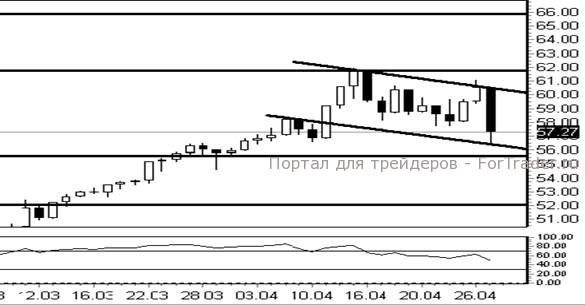 При пробое вверх линии сопротивления можно открывать длинную позицию с целью на уровень сопротивления 62$.В случае пробоя уровня сопротивления 62$ – цель на 64-66$.