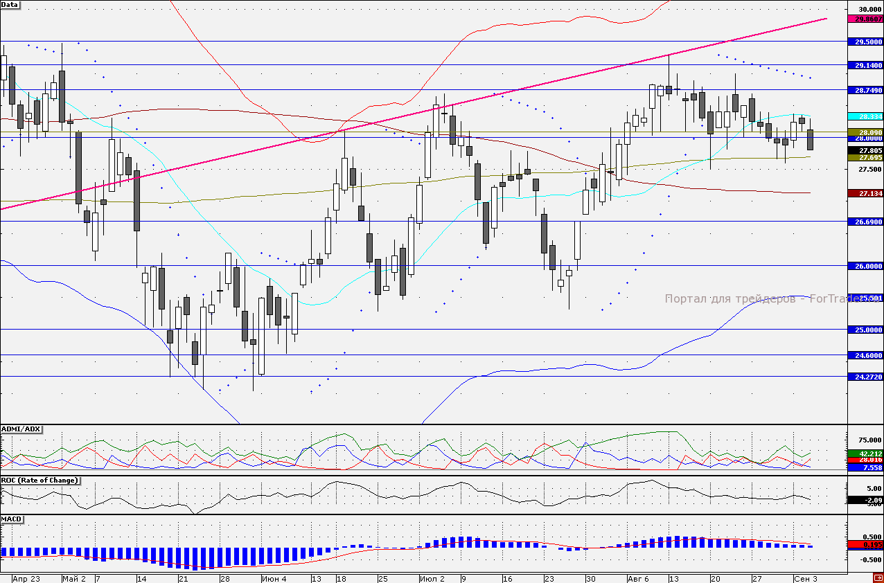 Обыкновенные акции «Сургутнефтегаза» сегодня продолжают откатываться вниз от 100-дневной скользящей средней (28,30 руб.). Ближайшим уровнем поддержки по бумагам выступает 200-дневная скользящая средняя (27,70 руб.), при достижении которой ввиду сохраняющейся неопределенности короткие позиции по бумагам стоит сокращать и открывать новые при закреплении акций ниже 200-дневной скользящей средней. Таким образом, при сохранении негативных настроений по бумагам следующей целью для снижения выступит 100-дневная скользящая средняя, которая сегодня располагается на отметке 27,10 руб. Наш 30-минутный торговый робот находится в «шортах» от отметки 28,09 руб., но при улучшении настроений готов изменить позиции.