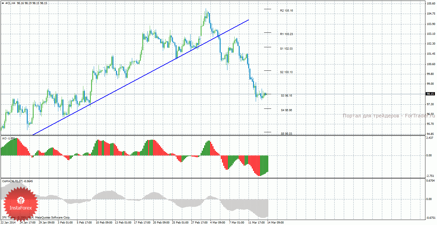 Анализ сырой нефти за 14 марта показывает, что цена продолжает нисходящее движение и отработала уровень поддержки 98,16, который пока не преодолела. Нисходящее движение может продолжиться с целями S4 – 96,96 и S5 – 95,03, если цена закрепится ниже уровня 98,16. Может начаться восходящая коррекция с целями 100,10 и 102,03, в случае, если цена отскочит от уровня 98,16. Восходящая линия тренда больше не оказывает поддержку торгующим на повышение, цена располагается ниже нее, поэтому сейчас стали актуальными короткие позиции. Индикатор Awesome показывает текущее восходящее движение, так как последний закрытый бар зеленого цвета. OsMA также развернулся наверх, что говорит о восходящем характере движения и в более долгосрочном плане. Отскок от уровня 98,16 может спровоцировать виток восходящей коррекции. Оба индикатора начали разряжаться, так как цена не повышается.