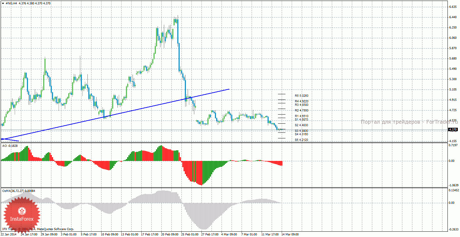 Анализ природного газа за 14 марта показывает, что цена продолжает слабое нисходящее движение, оба индикатора направлены вниз. На данный момент актуально нисходящее движение с целями уровни поддержки S4 – 4,3160 и S5 – 4,2120, если цена останется ниже уровня 4,3800. Целями для возможной восходящей коррекции выступают уровни сопротивления 4,4830 и 4,5870, если цена закрепится выше уровня 4,3800. Цена закрепилась ниже восходящей линии тренда, поэтому она более не актуальна, тенденция на рынке поменялась на нисходящую. Нисходящей линии тренда пока что нет. Индикатор Awesome показывает локальное нисходящее движение, последний закрытый бар окрашен в красный цвет. OsMA также направлен вниз, что сигнализирует о нисходящем движении цены на газ и в более долгосрочной перспективе.