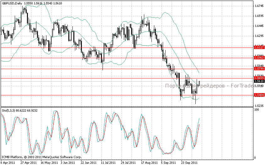 Как и предполагалось, валютная пара нашла поддержку в области 1,5400, дальнейший рост проходит в начале недели к отметке 1,5600. Рост может быть ограниченным, инвесторы опасаются слухов о возможном понижении рейтинга. Восходящее движение приостановится в области 1,5600, где находится опционная отметка и большое скопление ордеров на продажу.