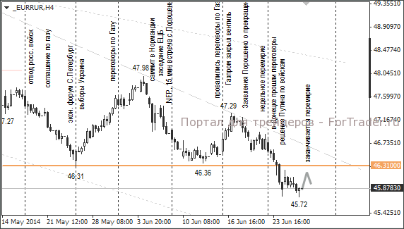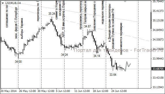 Как и ожидалось, рублёвые пары провели день в ценовом диапазоне среды. Сегодня для рубля очень важный день, поскольку истекает срок перемирия на Украине. Пётр Порошенко рассчитывает заключить мирное соглашение до истечения этого срока. Если ЛНР и ДНР откажутся поддержать его мирный план, скорее всего, войсковая операция на юго-востоке страны будет продолжена. Продление срока перемирия окажет поддержку рублю. Поскольку новостной фон из Украины сейчас первичен, на пятницу по доллару и евро ожидаем незначительный рост до 33,90 и 46,20 соответственно.