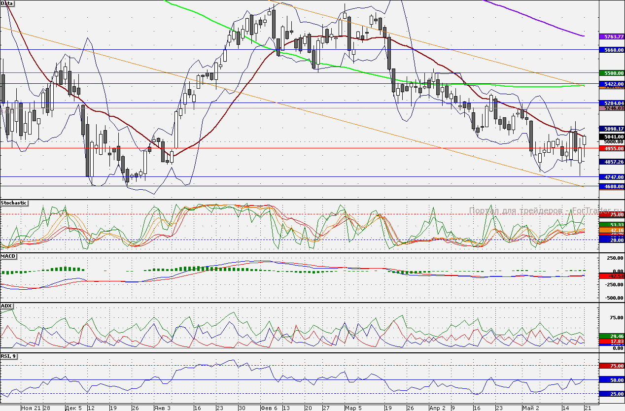 Акции ГМК «Норникель» закрылись на 21-дневной скользящей средней. Бумаги компании удержались выше 5000 руб. От психологической отметки «лонги» можно наращивать, поскольку 24 мая состоится закрытия реестра. Поддержкой является 4850 руб.