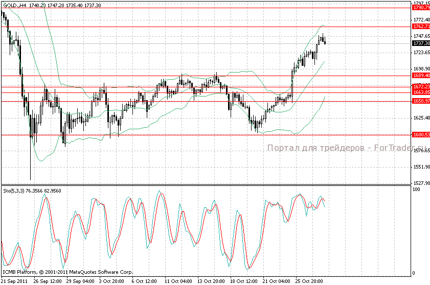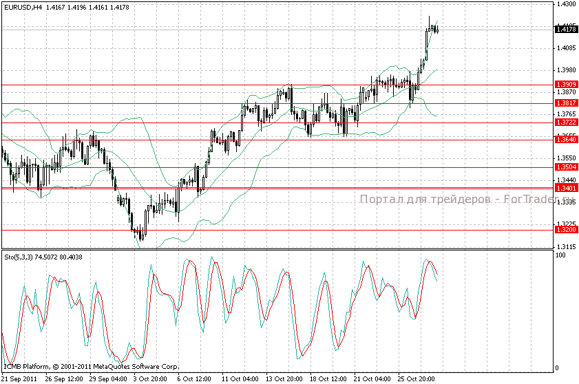 Весь основной информационный фон сформирован в ходе предшествующих сессий, игроки продолжают отыгрывать новости от саммита EC, а также сильные статистические данные по США. Данные по ВВП США за 3 квартал совпали с прогнозом, вышли также приятные данные по рынку труда. Сегодня истекает опцион по паре в области 1,4100, таким образом, если отметка будет пройдена вниз, то можно ожидать коррекцию к 1,4000.
