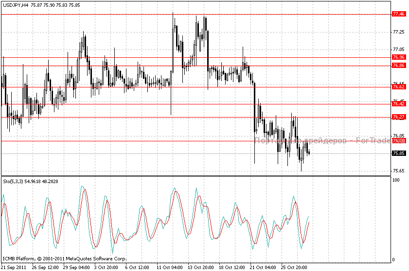 Вышедшие данные по рынку труда Японии оказывают поддержку продавцам, безработица в стране составляет 4,1% против прогноза 4,5%. В области 76,00 стоит большое скопление ордеров на продажу, поэтому можно ожидать, что неделя завершится в этой торговой области. Тем не менее, уже в начале следующей торговой недели можно ожидать появления покупок и второй волны роста к 76,60.