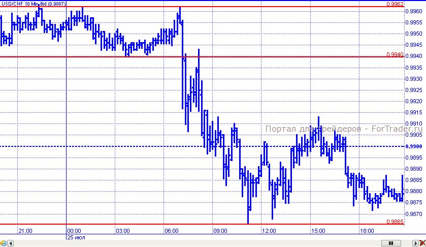 Восстановить часть потерь против доллара смог в среду и швейцарский франк. Начав день в пределах узкого диапазона 0,9940 – 0,9962 цены преодолели его нижнюю границу. В рамках нисходящего движения пара смогла зафиксироваться и ниже уровня 0,9900, отметив внутридневной минимум на уровне 0,9865, от которого совершила возвратный ход к отметке 0,9910. Торговые сутки пара завершила в районе уровня 0,9880.