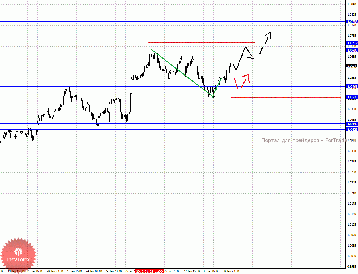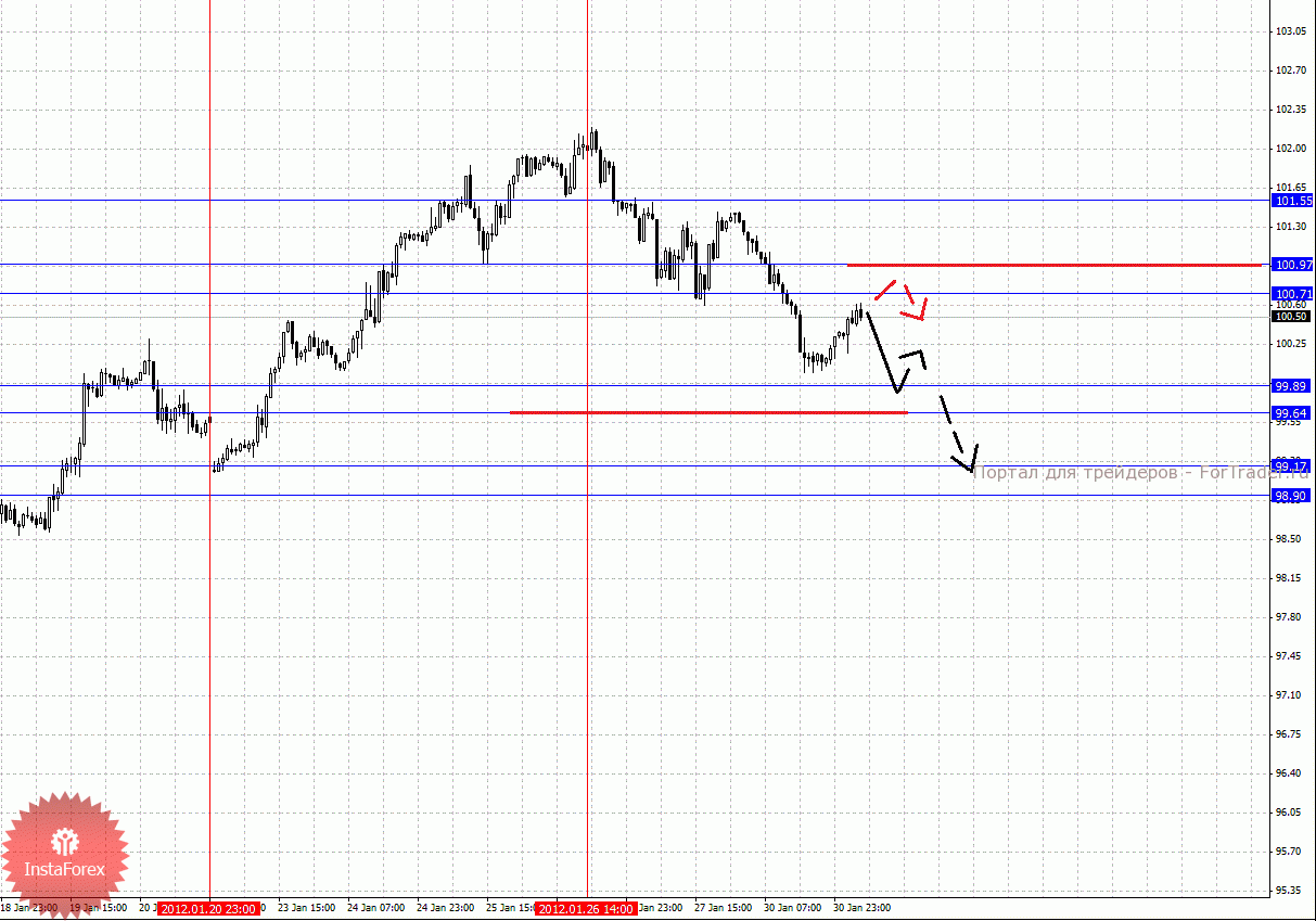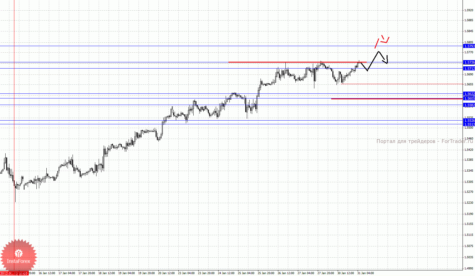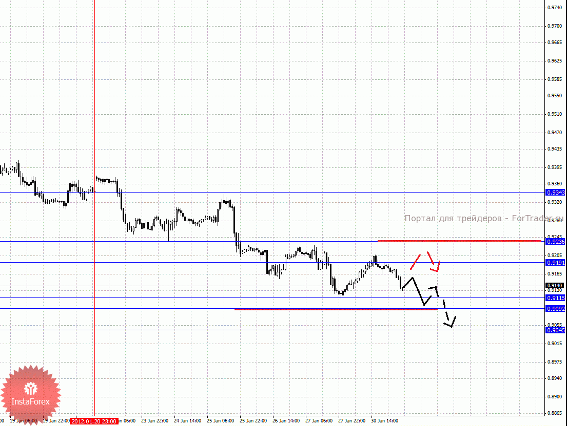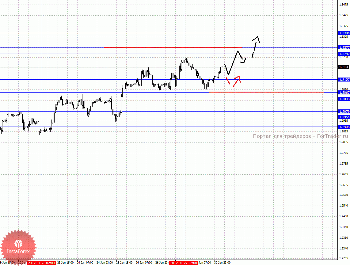По паре Евро/Доллар важными уровнями являются: 1.3344, 1.3277, 1.3247, 1.3127, 1.3067, 1.3038, 1.2979, 1.2954 и 1.2908. Здесь восходящую структуру от 27 января можно рассмотреть в качестве потенциальных начальных условий для нисходящего движения, однако по паре Доллар/Франк данная структура выглядит менее убедительно. Продолжения движения кверху ожидаем после прохода ценой шумового диапазона 1.3247 – 1.3277, в данном случае цель – 1.3344, по достижении этого уровня ожидаем консолидацию. Уровень 1.3127 является ключевым сопротивлением для низа, его пробой приведет к движению до первой цели – 1.3067, в коридоре 1.3067 – 1.3038 консолидация цены. Пробой уровня 1.3038 должен сопровождаться импульсивным движением к уровню 1.2979, в коридоре 1.2979 – 1.2954 консолидация цены. Потенциальным значением для низа считаем уровень 1.2908, по достижении которого ожидаем откат кверху.