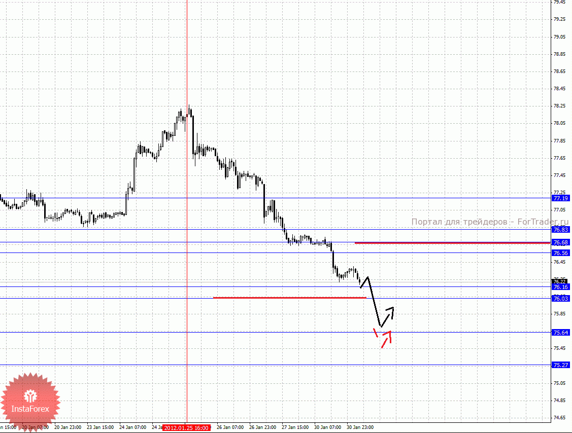 По паре Доллар/Йена ключевыми уровнями являются: 77.19, 76.83, 76.68, 76.56, 76.16, 76.03, 75.64 и 75.27. Здесь мы продолжаем следить за нисходящим циклом от 25 января. Продолжения движения книзу ожидаем после прохода ценой шумового диапазона 76.16 – 76.03, в данном случае цель – 75.64, от этого уровня высока вероятность разворота кверху. Потенциальным значением для нисходящего движения считаем уровень 75.27, однако его достижение маловероятно и наиболее рационально работать от данного значения. Краткосрочное восходящее движение возможно в диапазоне 76.56 – 76.68, пробой последнего значения приведет к углубленной коррекции, здесь цель 76.83. Уровень 76.83 является ключевым сопротивлением для верха, его пробой будет располагать к развитию восходящей структуры, в данном случае потенциальная цель 77.19.