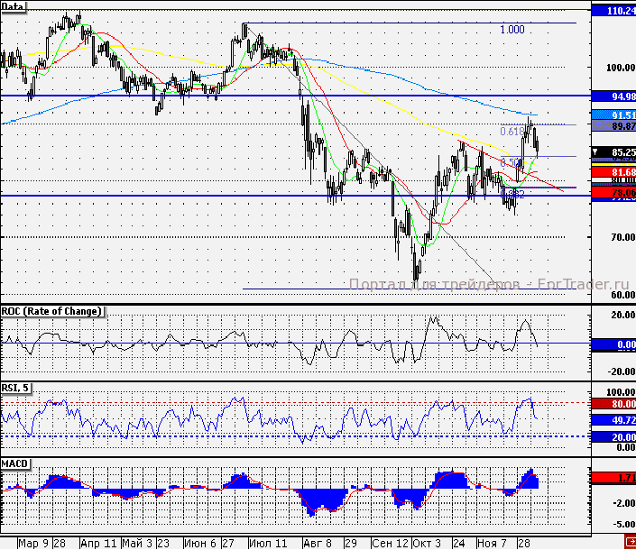 Акции банка удержались выше 50%-ой коррекции по Фибоначчи между июльским максимумом и октябрьским минимумом текущего года – 84,40 руб. В случае ухудшения настроений данная отметка может быть вновь протестирована. При этом закрепление ниже откроет технический потенциал снижения в район 78,85 руб., к тому же в указанном районе имеется незакрытый гэп. Таким образом, в случае закрепления ниже уровня 84,4 руб., агрессивные инвесторы могут рискнуть открыть спекулятивный шорт. Однако риски довольно высоки: позитивные итоги заседания ЕЦБ способны вернуть покупателей в подешевевшие бумаги.