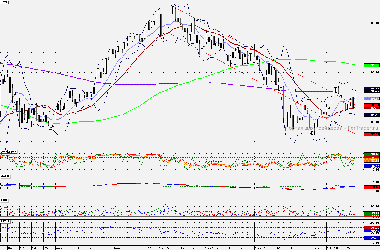 Акции Сбербанка закрылись чуть выше 200-дневной скользящей средней. При продолжении роста цлью станет отметка 87 руб., от данного уровня лонги стоит сокращать. Поддержкой является 85 руб.