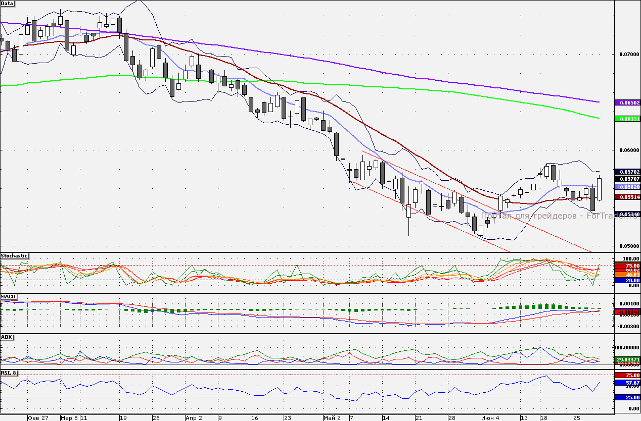 Акции ВТБ могут продолжить торговаться вблизи уровней закрытия. Сопротивлением является 5,800 коп. Поддержкой является 10-дневная скользящая — 5,614 коп.