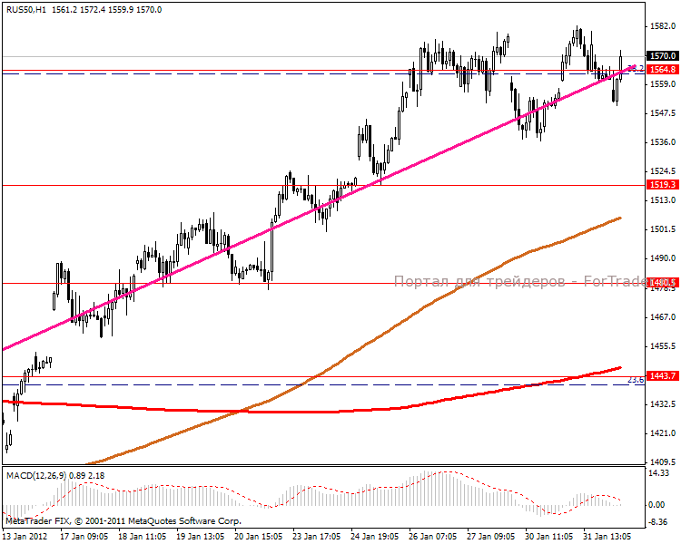 Часовой период показывает закрепление на сильной линии поддержки в 1564 пункта. После просадочных направлений вероятнее всего будет растущая динамика дальнейшего движения. Сегодня вероятнее всего будет движение в диапазоне 1560-1579 пунктов. MACD склоняет к боковику с незначительным укреплением.