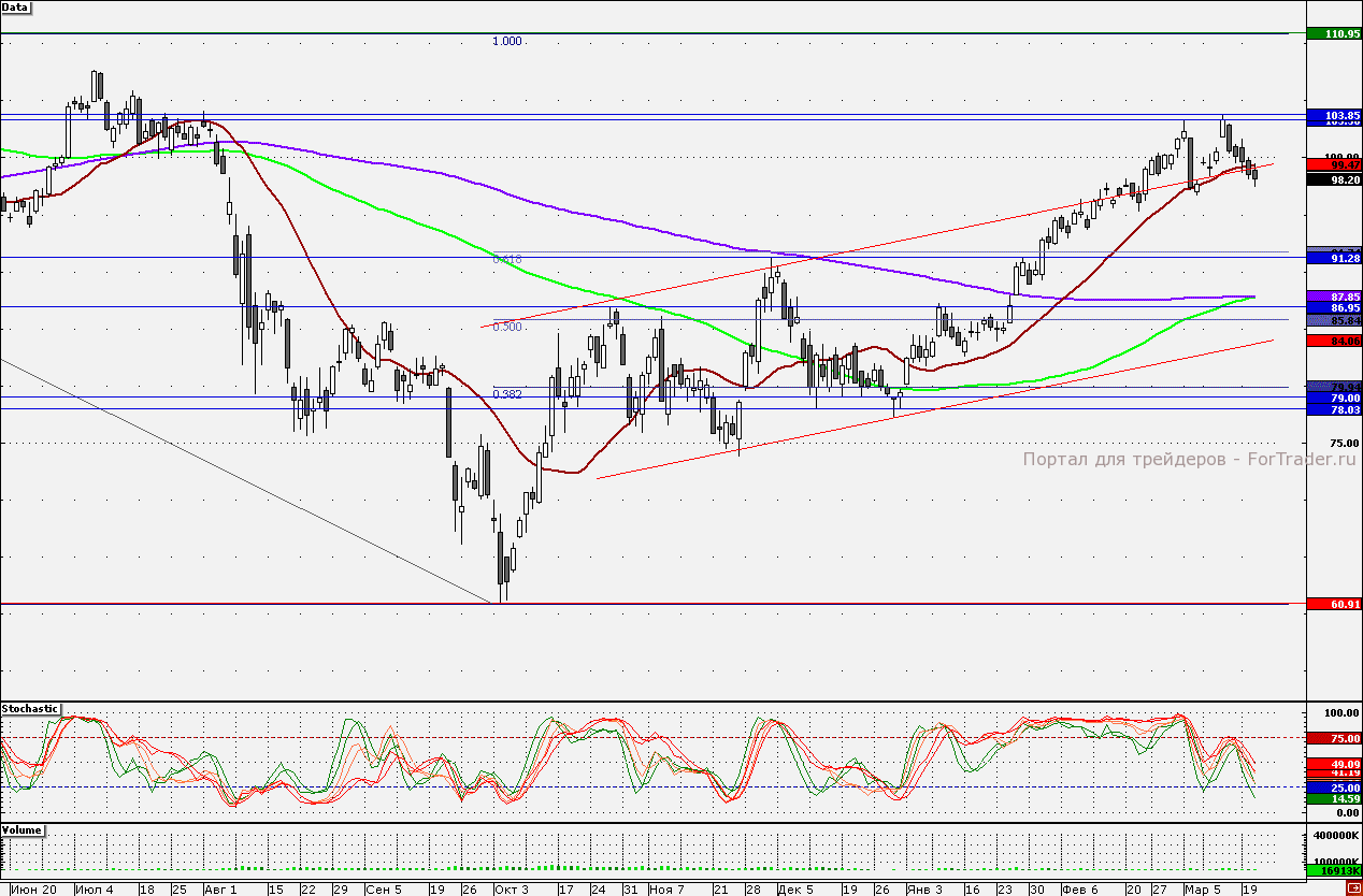 Акции Сбербанка вчера закрыли гэп от 11 марта 97,68 руб. Сегодня внешний фон умеренно-негативный, в связи с чем акции могут продолжить снижение. Поддержкой является отметка 97,00 руб., от которой «лонги» стоит спекулятивно наращивать. Сопротивлением является 99,37 руб., где проходит 21-дневная скользящая средняя.