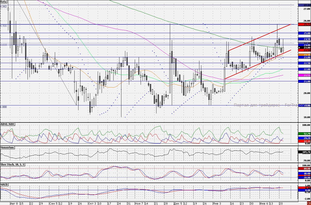 Однако в случае формирования негативных настроений, нижняя граница восходящего канала все же может не устоять. Пробитие нижней границы канала 23,30 руб. может поставить техническую цель, расположенную ниже точки пробития и равной ширине канала. Сегодня данная цель находится примерно уровне 21,00 руб.