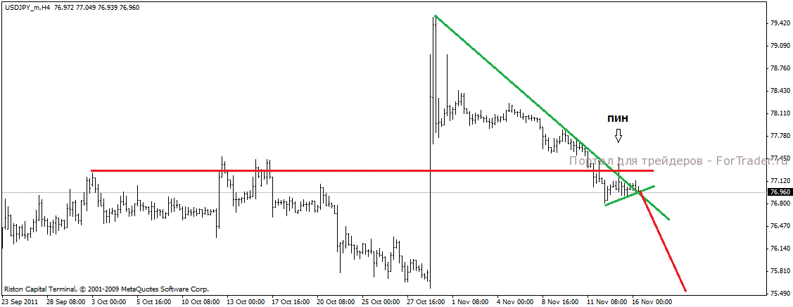 После пробоя уровня поддержки, цена на слиянии этих уровней и линии тренда сформировала пин бар, что указывает на то, что в дальнейшем снижение пары продолжится.