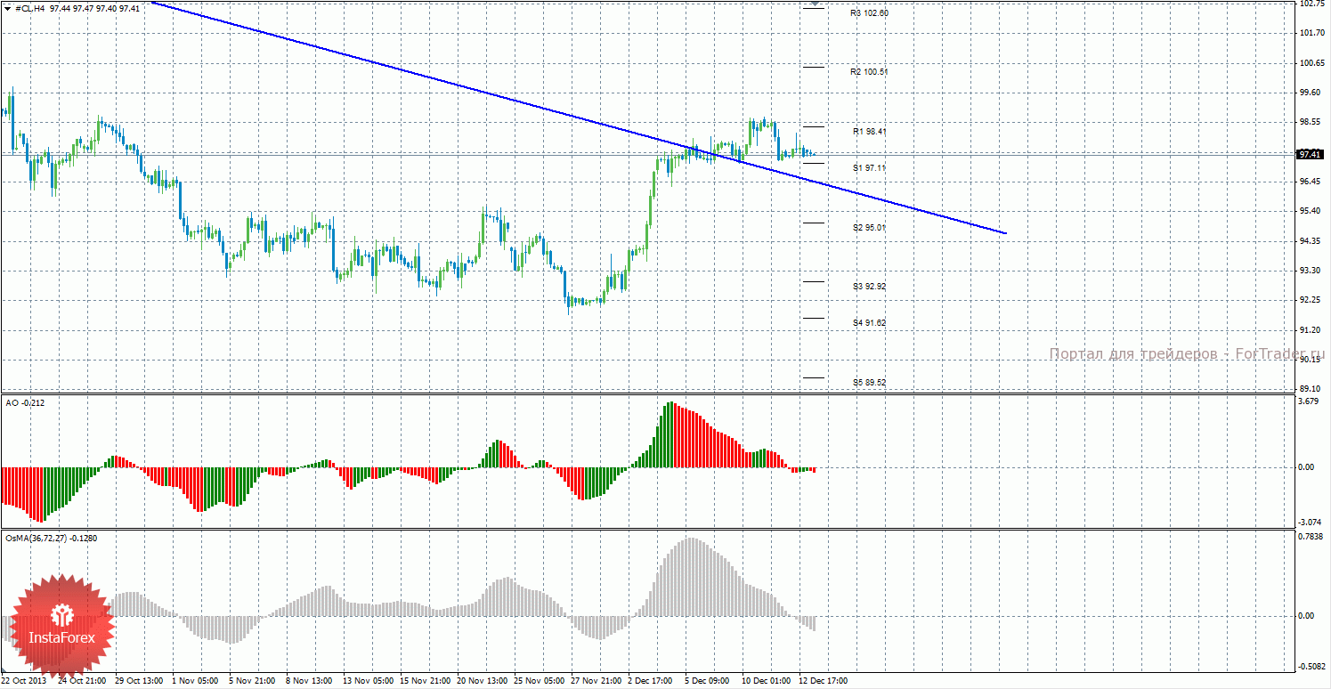 Анализ сырой нефти за 13 декабря показывает, что цена продолжает корректироваться и находится между уровнями S1 и R1, продолжить коррекцию пока что не может. Восходящее движение может возобновиться с целями R1– 98,41 и R2 – 100,51, если цена отскочит от уровня 97,11. Может продолжиться нисходящая коррекция с целями 95,01 и 92,92, в случае если цена закрепится ниже уровня 97,11. Нисходящая линия тренда больше не оказывает поддержку торгующим на понижение, так как цена закрепилась выше нее. Новой восходящей линии тренда пока что нет. Индикатор Awesome показывает текущее нисходящее движение, так как последний закрытый бар красного цвета. OsMA также направлен вниз, что говорит о нисходящем характере движения и в более долгосрочном плане. Если цена отскочит от уровня 97,11, это может спровоцировать возобновление восходящего тренда.