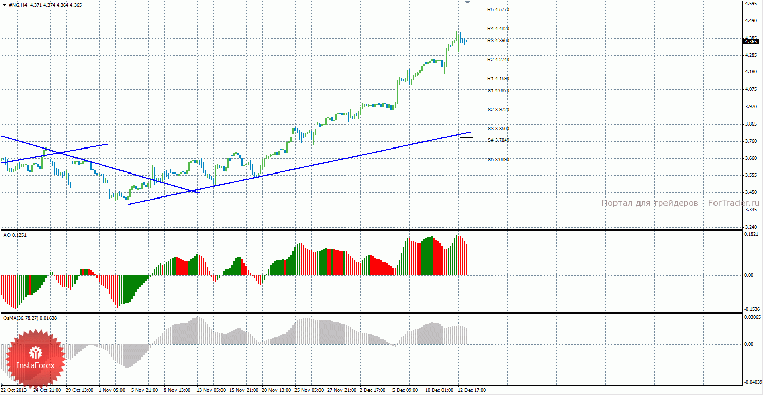 Анализ природного газа за 13 декабря показывает, что цена продолжает восходящее движение и отработала уровень сопротивления R3 – 4,3900. На данный момент актуально восходящее движение с целями уровни сопротивления R3 — 4,3900 и R4 – 4,4620. Целями для возможного начала нисходящей коррекции выступают уровни поддержки 4,2740 и 4,1590, если цена отскочит от уровня 4,3900. Восходящая линия тренда оказывает поддержку торгующим на повышение, ниже нее цена закрепиться пока не смогла. Индикатор Awesome показывает локальное нисходящее движение, последний закрытый бар окрашен в красный цвет. OsMA также развернулся вниз, что сигнализирует о нисходящем движении цены на газ и в более долгосрочной перспективе. Отскок от уровня 4,3900 может спровоцировать виток нисходящей коррекции. Оба индикатора могут разряжаться.