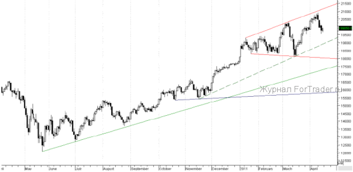 На дневном графике фьючерса на индекс РТС сложившаяся техническая картина как нельзя лучше отражает нестабильность. Расширяющаяся формация 2011 года, внутри которой в данный момент развивается движение от верхней границы к нижней, позволяет зарабатывать как на росте, так и на снижении котировок фьючерса на индекс РТС.