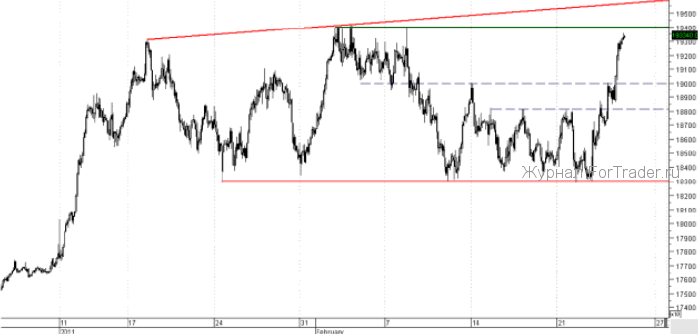 На прошедшей неделе на отечественном срочном рынке фьючерс на индекс РТС вырос до основного уровня сопротивления после очередной неудачной попытки пробоя поддержки боковика вниз. Нефтяные пертурбации в течение прошлой недели вызвали аналогичные по оправданности движения нефтяных фишек на отечественном срочном рынке. Следующая неделя с 28 февраля по 5 марта будет шестидневной из-за последующих выходных праздничных дней, что создаст неудобства при переносе позиций через выходные, которые придутся на рабочие дни во всем остальном финансовом мире.