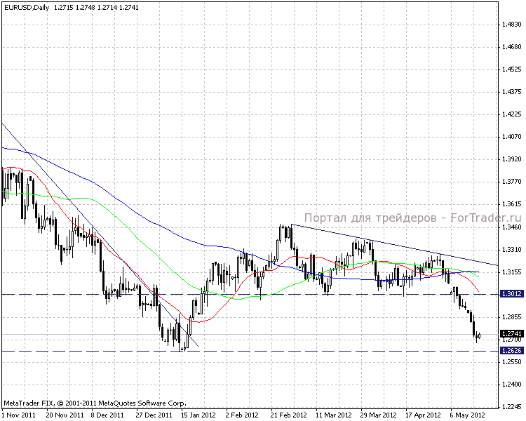 Фигура технического анализа «треугольник» на дневном графике подсказывала о возможном начале новой нисходящей тенденции, которая на сегодняшний день подтверждается парадом линий скользящих средних. Судя по высоте треугольника, можно спрогнозировать начало возможного отката в отметке 1,2620-1,2630. Глубина коррекционного движения будет в район 1,2850-1,2950.